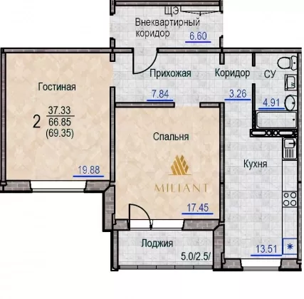 В избранное 2-к. квартира, 69,4 м², 5/7 эт.